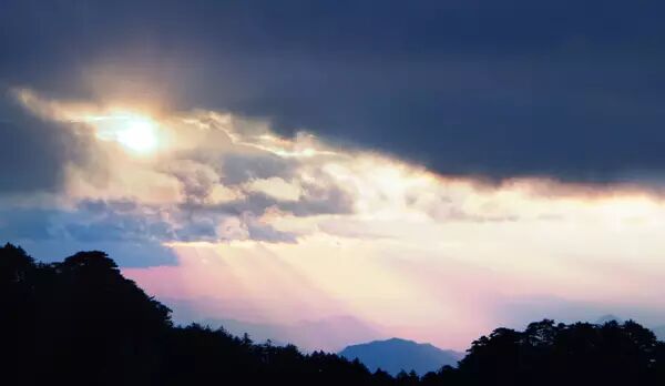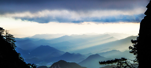 照片的拍摄地是安徽黄山。当时的天气状况不太好,事实上我也没能拍到日出的那一瞬间——因为云层太厚,完全被挡掉了。只有缝隙里透出的一丝微光提示着它的存在。偶尔云层会散开一点,于是才抓到了上面的两张图。