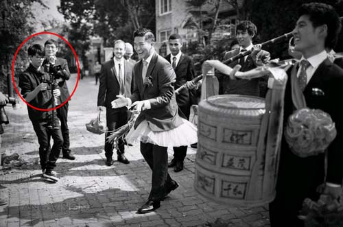 于是我就发现这个办法其实蛮方便的,除了证明你在场,它还能帮助你去向新人解释,你是怎么组织你的团队的,你在哪些地方安排了机位,你的助理们如何工作……正是这些“穿帮”镜头向新人们解释了你的工作流程,也能看出你的专业性:噢,真正的婚礼摄影团队是这样工作的。谈生意时自然轻松很多。