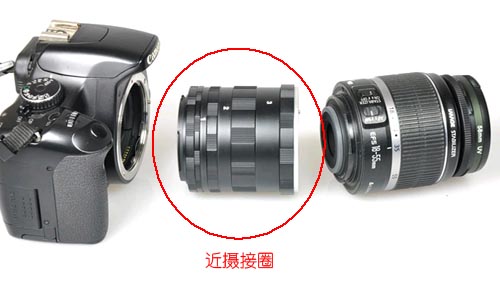 装上接圈就可以把狗头变成微距头。通常有7mm(1号)、14mm(2号)和25mm(3号)三种,它们可以单独使用或组合使用,产生不同程度的微距效果。